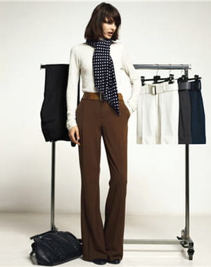 Aujourd'hui c'est rendez-vous professionnel au programme. Pour être chic et à l'aise à la fois, on opte pour cette tenue des 3 Suisses qui plus est définitivement tendance. On aime plus que tout le pantalon banane évasé au marron dans l'air du temps et joliment ceinturé pour marquer notre taille. On n'hésite pas à y glisser à l'intérieur un col roulé écru de saison et le tour est joué. La petite touche en plus : le chèche à pois pour un petit effet rétro et glamour.