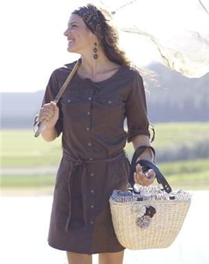 Voilà de quoi se composer un look safari chic pour les aventurières à la ville ! Cette robe façon saharienne en coton de Gémo est agrémentée d'une ceinture à nouer et de manches disposant de pattes boutonnées pour les relever au gré de ses envies. Une tenue tendance et pratique, disponible aussi en kaki et en noir.