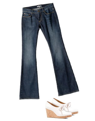 Depuis quelques saisons, le jean flare revient en force pour apporte une touche seventies à une tenue. Avec ces chaussures compensées en liège, plus de doute, vous imposerez votre style "flower power" avec brio. A assortir avec des lunettes de soleil mouche et un top coloré aux imprimés psychédéliques !