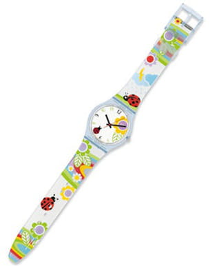 Chez Swatch, on passé clairement à l'heure d'été avec cette montre ornée de motifs champêtres. Coccinelles, fleurs... Tout y est pour vous évader un temps vers un pique nique bucolique, à la campagne.