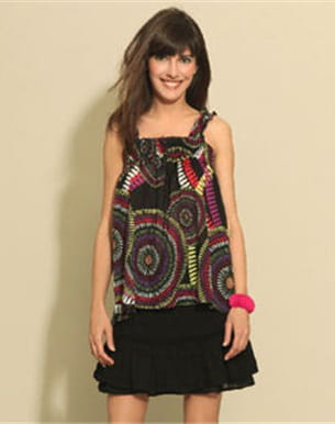 Dans un style Arty des plus actuels, ce débardeur de Promod fait s'entrechoquer les couleurs et le noir... Et voici le résultat, un haut ultra branché doté notamment de quelques smocks et d'un ruban satiné à nouer sur le devant pour la note romantique. On adore !