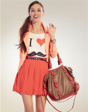 Trench court pêche, t-shirt I love Moustache et jupe à pois rouge de Cache Cache