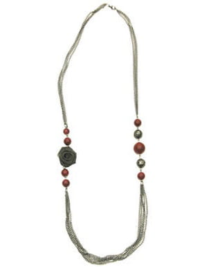 Superposition de chaînettes, décoration fleur, boules argentées et rouges : voici la combinaison que propose Vêti pour ce sautoir à porter avec tout et en toutes circonstances. On adopte donc sans hésiter ce bijou petit prix qui trouvera tout naturellement sa place dans le tiroir des accessoires fantaisie.
