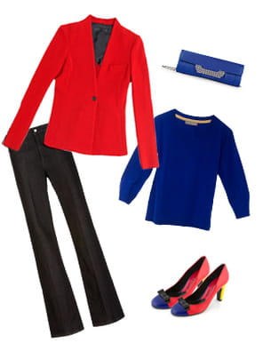 La tendance colo block n'a pas dit son dernier mot. La preuve avec ce petit look qui vient réveiller notre jean flare. Un pull bleu klein en cashmere que l'on retrouve également sur la pochette donne le ton de la tenue. L'hiver sera coloré ou ne sera pas. Alors autant se faire plaisir et pour respecter le code couleur des escarpins imaginés par Jean-Charles de Castelbajac pour Mellow Yellow, on ose la veste rouge. Avec un tel look, impossible de passer inaperçue !