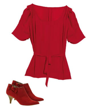Cap sur une allure glamour avec une jolie blouse ceinturée des low-boots façon veau velours. Les deux pièces affichent un joli rouge affirmé qui ne manque pas de caractère. Les bottines affichent un détail trendy avec un petit nœud tandis que la blouse se distingue avec des manches 3/4 travaillées.