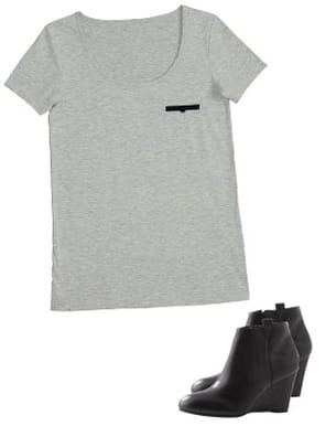 Les basiques sont des valeurs sûres de notre garde-robe et nous assurent un petit look trendy en un clin d'œil. Le tee-shirt se fait simple mais fashion avec une poche en trompe-l'œil sur la poitrine. En plus, vu son mini-prix, on ne peut pas résister. Les bottines jouent sur la tendance avec des semelles compensées qui confèrent un vrai style.