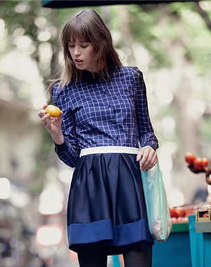 Définitivement dans la tendance du moment, cette jupe évasée est signée Claudie Pierlot. On aime évidemment son trio de couleurs, noir, bleu et blanc, mais aussi le petit look qu'elle nous procure avec un joli top et des gros collants. Il nous la faut !  Collection automne-hiver 2011-2012