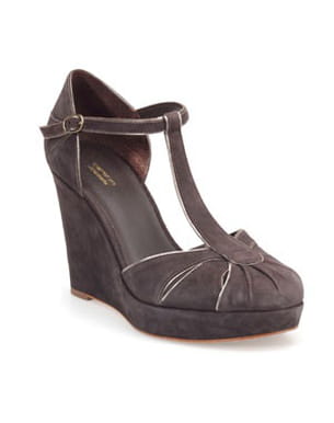 La chaussure compensée n'est pas réservée aux beaux jours. La preuve avec ce modèle de salomés à talon compensé et en cuir signées Comptoir des Cotonniers. On aime les détails irisés qui contrastent avec le coloris gris de la chaussure. Des fronces et des découpes habillent le devant du pied. A adopter de toute urgence pour les fêtes de fin d'année. On craque ! Collection automne-hiver 2011-2012