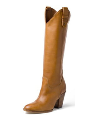 On aime ces bottes en cuir couleur camel à l'esprit cow-boy chic. Le plus : le talon imitation bois de 8 cm qui nous donne l'impression d'être grande en toute circonstance.  Aussi chics que branchées ces bottes sont  une valeur sûre de l'hiver. Collection automne-hiver 2011-2012