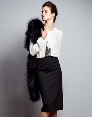 Le tailleur-jupe prend des airs de fête chez Sinequanone avec cette chemise à dentelle sur le devant et sa jupe crayon en laine sèche couleur réglisse. Une façon originale de se réapproprier un classique de notre garde-robe, juste pour les grandes occasions. Collection automne-hiver 2011-2012