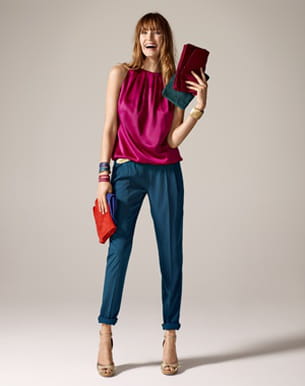 On ose la couleur pour les fêtes avec cet ensemble de chez Camaïeu. On aime l'association du top satiné rose et du pantalon chino vert. A associer avec des escarpins dorés pour une tenue très tendance. Collection automne-hiver 2011-2012