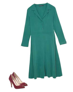 On surfe sur la tendance color block, en s'offrant cette robe verte 100% soie de chez Ekyog. A accessoiriser avec une fine ceinture pour souligner notre taille. Et pour l'accompagner, on chausse ces escarpins en velours bordeaux. Un accord parfait pour un style définitivement tendance.