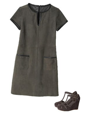 Très élégante, cette robe en peau de chez Caroll s'adaptera à toutes les situations. On aime son col tunisien et ses deux poches bordés de cuir. A associer avec ces magnifiques salomés compensées en velours et légèrement irisées signées Comptoir des Cotonniers. On adore !