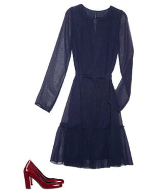 On s'offre une allure rétro cet hiver avec cette robe à manches trois-quarts en voile, charmante avec ses jolis pois. Avec son col Claudine et ses volants, elle nous assure une ligne féminine. Et pour rappeler la couleur de l'imprimé, on adopte les escarpins vernis bordeaux de Minelli.