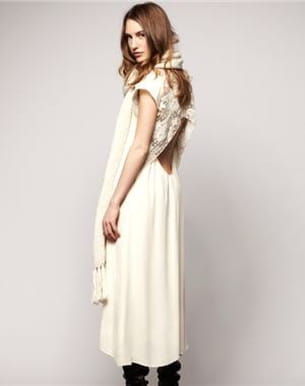 On joue la carte de l'originalité avec cette robe écrue en soie brodée des Fées de Bengale. Le petit plus : le décolleté dans le dos qui nous descend jusqu'aux reins pour un côté sensuel, mais aussi les broderies pour un effet des plus romantiques. Collection automne-hiver 2011-2012