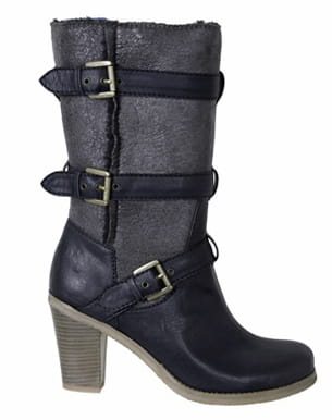 La mode est aux bottes en peau. Pas toujours facile d'adopter cette tendance. Pour celles qui hésiteraient un peu, voilà un modèle qui va venir à bout de leurs dernières réticences. Bleu marine, ces chaussures jouent sur les matières. Sanglées, elles affichent un maximum de style et nous permettent de la hauteur avec un haut talon.