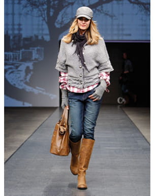 Ce matin les températures ont chuté et vous choisissez de vous blottir dans un pull moelleux, qui associe confort et décontraction. Pour se promener avec les enfants, rien de tel en effet qu'une tenue pratique! Au programme : longues mitaines, gilet à grosses mailles, chemise de bucheron et bottes sans talon. Pour éviter les courants d'air, vous enroulez un chèche noir autour du cou, et enfoncez votre jean dans vos grandes bottes. Pour féminiser ce look de "trappeuse des villes", coordonnez les chaussures et le sac, et préférez un jean stretch.