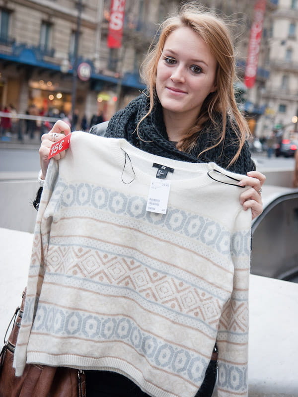 Valentine avait fait des repérages la veille dans les magasins de Rosny près de chez elle. Le jour J, elle a foncé droit chez H&M pour dénicher ce pull à 15 € avec 50% de réduction. Elle ne cherche rien de particulier, juste de bonnes affaires. Son budget maximum est fixé à 130-200 €.
