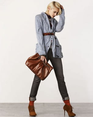 Enfin une occasion de retrouver vos amis ! Pour cette soirée, vous décidez de sortir une paire de low boots à talons que vous coordonnez à un slim brut, retroussé dans le bas pour l'effet tendance. Pour le haut , misez sur une veste épaisse en maille et  un tee-shirt fantaisie. Le petit truc en plus : ceinturez votre veste pour affiner la silhouette. Vous voilà prête !