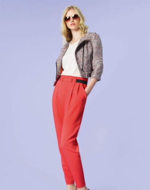 Cap sur les beaux jours avec cette tenue à la pointe de la tendance. Elle associe en effet un pantalon carrot au coloris corail punchy et une veste en tweed à l'esprit couture donc la coupe façon Perfecto fait toute la différence. On misera sur un top blanc pour un look très étudié l'air de rien.