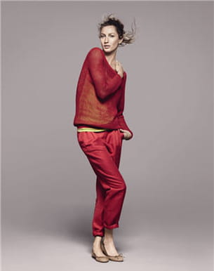Dans cette nouvelle ligne, la marque joue aussi avec les couleurs. Rouge, jaune citron, bleu ou encore rose poudré, il y en a pour tous les goûts. Des tons qui apportent une note de gaieté aux formes classiques des pièces. Gisele Bündchen porte ici un pantalon chino rouge et un pull d'été rouge légèrement transparent qui laisse deviner un débardeur jaune citron. Une tenue qu'on lui piquerait volontiers pour une virée en bord de mer ou une balade en ville. Des modèles à retrouver en boutique et sur le site internet de la marque !