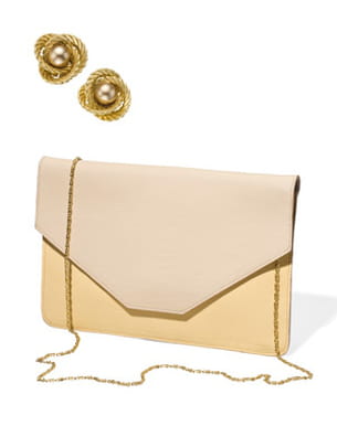 Les tons pastel et nude sont de saison. Alors on n'hésite pas à sortir notre jolie pochette à la forme enveloppe très classe. Avec sa anse façon chaîne, elle permet de se porter au bras comme à la main selon ses envies. On l'assortit à une paire de boucles d'oreilles. La perle encadrée de doré rappelle parfaitement les tons du sac avec discrétion. Mais n'est-ce pas ça le comble du chic ?