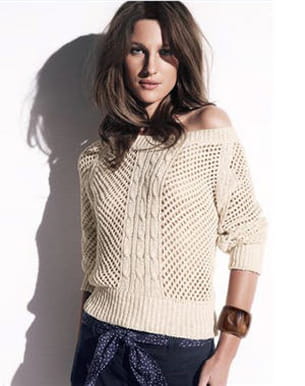 Tantôt torsadé tantôt ajouré, ce pull de Caroll se porte en toute simplicité au printemps. Son col bateau lui apporte chic et féminité tandis que son coloris craie se mixe avec tous les autres... Trop pratique ! Collection printemps-été 2012