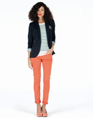 Quoi de mieux pour aller à la mer que de porter une marinière ? On la revisite en adoptant ce modèle signé Tissaia aux rayures vertes. Associé à un pantalon orange, un blazer avec écusson bleu marine et des escarpins corail, il vous assure le look parfait pour une virée en mer. Détail indispensable : le vernis à assortir à la couleur du pantalon. A l'abordage, matelot !
