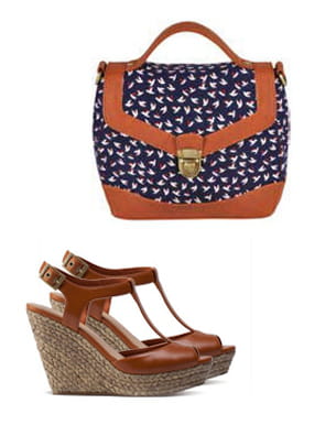 On n'a jamais autant aimé les hirondelles. Imprimées sur ce petit cartable rétro en tissu bleu et cuir marron, elles se marieront avec les sandales compensées en cuir de Bershka. Perchée sur 10,5 cm de talons, on pourra faire la belle sans complexe lors d'une balade en bord de mer.