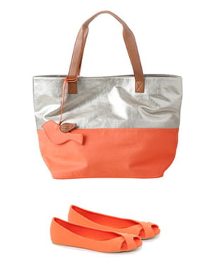 Pour avoir la pêche tout l'été, on adopte ce coloris fruité et gourmand. Les ballerines ouvertes dévoilent nos petits petons, et le grand sac bicolore avec une touche argentée sera parfait pour partir en vadrouille ou à l'assaut d'une soirée estivale. On adopte ce duo coloré et féminin de jour comme de nuit !