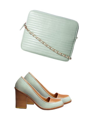 À la rédaction, on est fans du vert d'eau. Il n'en a pas fallu beaucoup plus pour nous convaincre que ces pièces étaient faites pour aller ensemble... Un sac matelassé avec une chaîne en guise de anse et des chaussures tout droit sorties d'un rêve : on veut les deux !