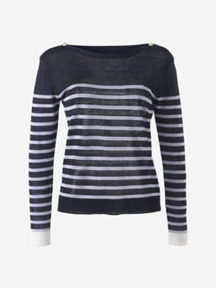 Les courants d'air du bord de mer ne nous font plus peur avec cette marinière tout en légèreté. Ses plus ? Ses rayures parme, plus originales que les blanches, et son prix réduit, évidemment.