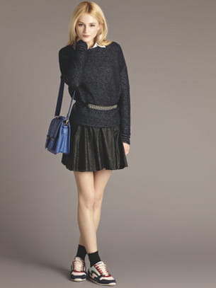 Rock : jupe en simili cuir et pull bleu marine de La Halle