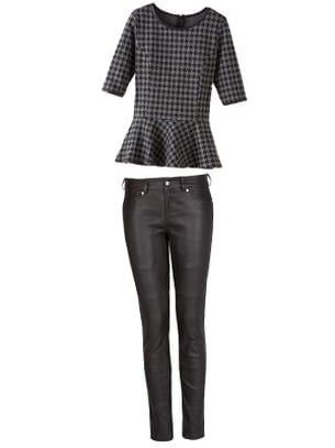Jean en cuir de Mango et top pied-de-poule des 3 Suisses