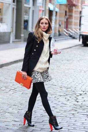 On le sait, Olivia Parlemo ne commet que très rarement des faux-pas côté style. Une fois de plus, c'est un sans-faute. On lui pique volontiers sa tenue (Oh my God, ses chaussures !) mais aussi son caban, facile à copier. L'esprit militaire du double-boutonnage impose une touche de rigueur qui autorise quelques excentricités. N'est-ce pas Miss Palermo ?