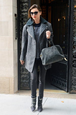 Le top australien affiche presque un nouveau manteau à chaque sortie. Ce modèle gris esprit Perfecto a retenu notre attention. Surtout quand il est porté sur une simple marinière et un slim noir. Ce n'est pas beau de copier, mais là, on peut non ?
