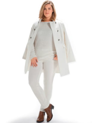 Manteau droit, pull blanc, pantalon push-up et boots marron de Balsamik