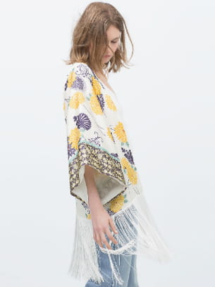 Top poncho blanc à franges avec imprimés jaune et violet de Zara
