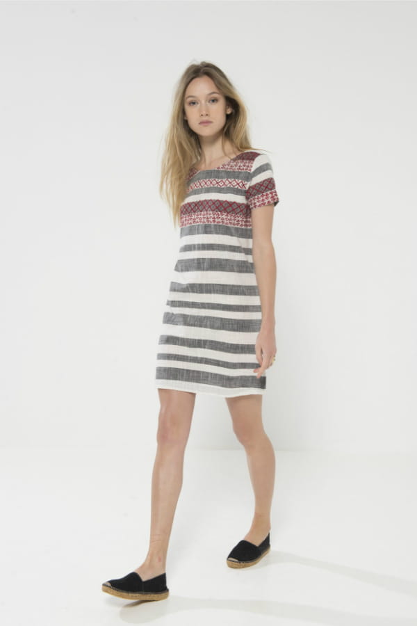 Robe rayée blanche et noire avec broderies rouges sur le buste et dos nu relié par deux bandes de tissu de Les Petites...