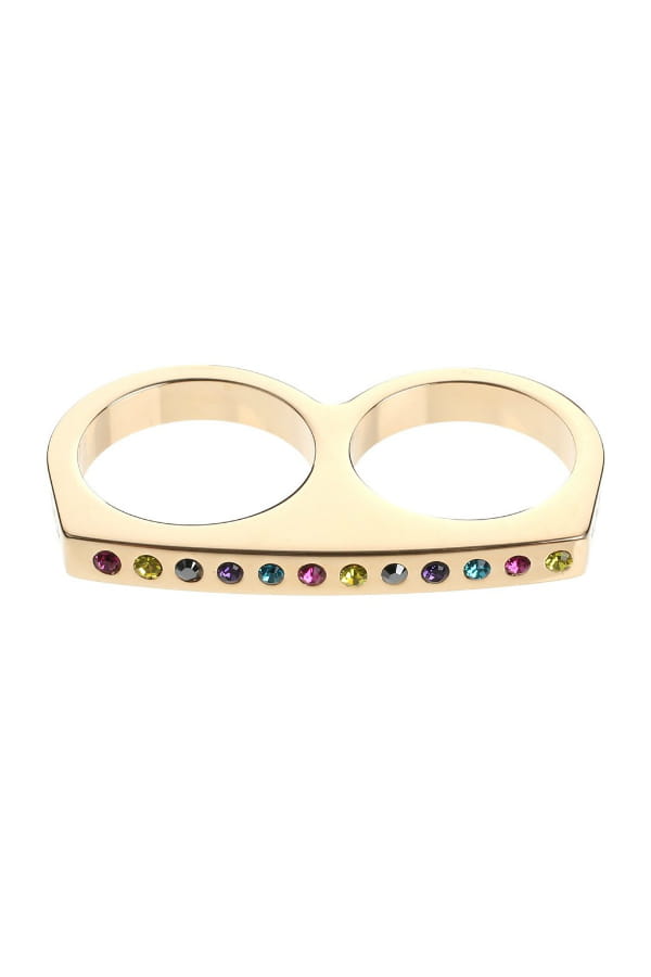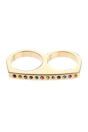 Bague deux doigts dorée avec incrustation de petits diam's de couleur de Maria Francesca Pepe chez Colette