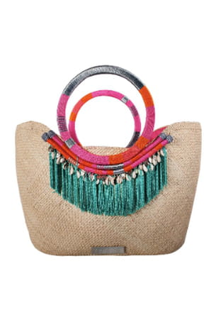 Cabas en paille à franges turquoise et anses rose et orange de Coffe sur brazilianbikinishop.com