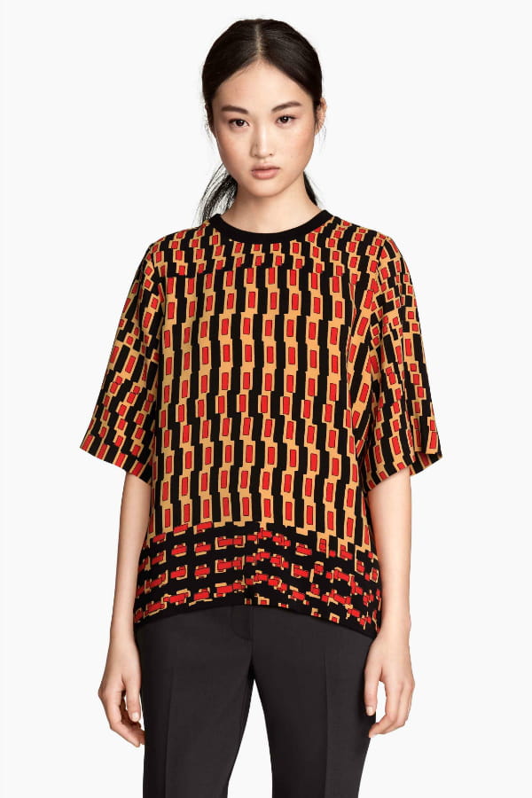 Blouse tissée à manches courtes et imprimé géométrique noir, rouge et or de H&M