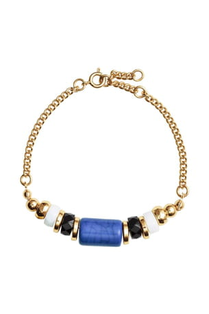 Bracelet constitué d'une chaîne en métal doré et de perles en plastique blanches, noires et bleues de H&M
