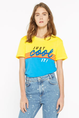 T-shirt bleu et jaune imprimé "Just cool it" de Sandro