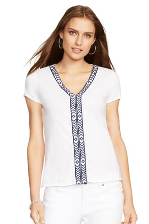 T-shirt blanc avec encolure en V brodée de Lauren par Ralph Lauren
