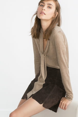 Pull fin beige avec noeud lavallière de Zara