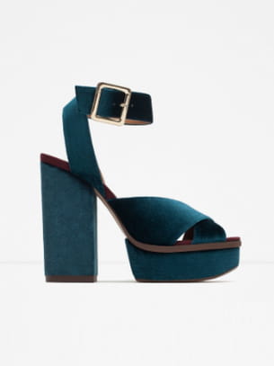 Sandales en velours bleu pétrole à talon carré et plateforme de Zara TRF