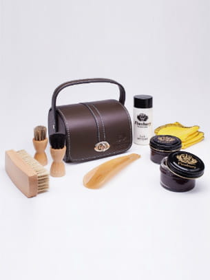 Malette pour entretenir les chaussures en cuir contenant une brosse, deux palots en crin de cheval, une chamoisine pour lustrer le cuir, deux crèmes de cirage, un lait nettoyant et un chausse pied en corne de Finsbury