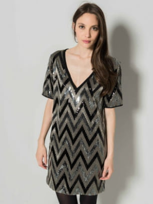 Robe courte coupe droite à manches courtes en col V, motif zig zag en sequins gris et noirs de Les Petites...