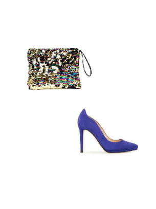 Pochette à sequins de Story of Lola chez Asos  et escarpins en cui rvelours bleus de Minelli